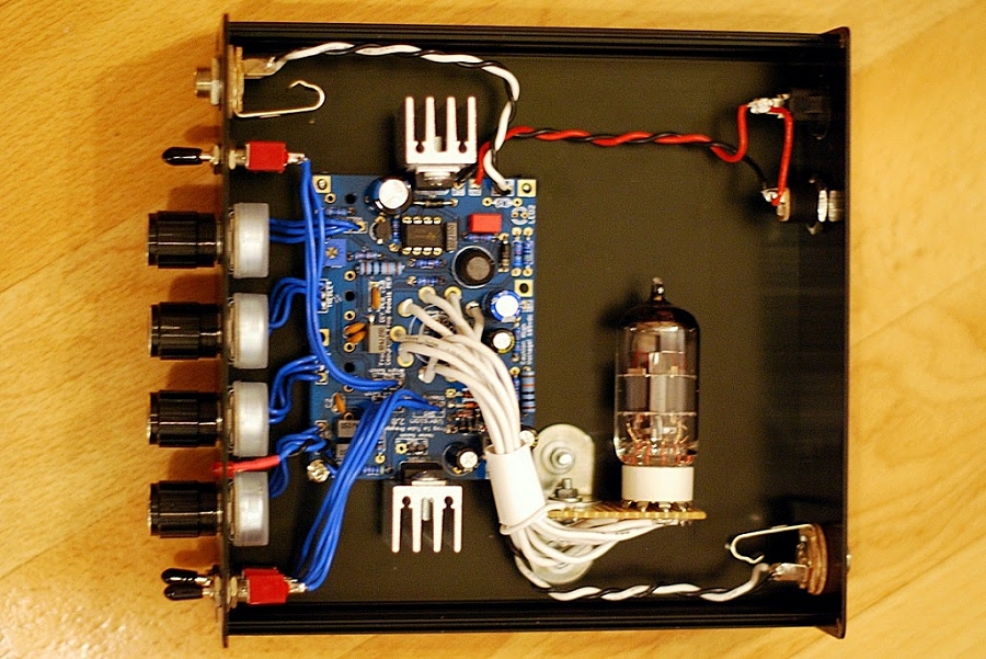 As you can see on the pictures, my build is PCB based and has some additional improvements - such as hi-cut switch, two switchable clipping diode pairs (Germanium and Silicon), and optional 6/12V tube heater switch. It's powered by standard 9V DC power supply - 9 volts DC is pumped up to a 185+ volts DC which is supplied to the standard tube amp circuitry for Class A operation.